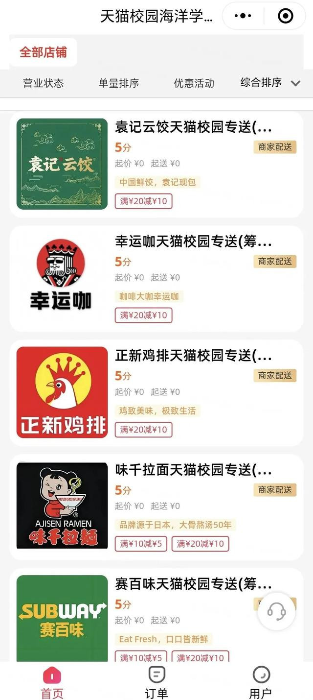入驻天猫校园外卖平台的商家不局限于校内,也有学校附近的校外商家。